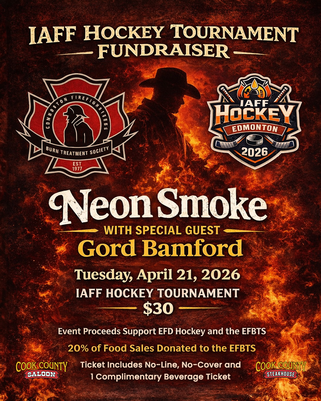 Join us at Cook County Saloon for a special night of live country music, community, and support for Edmonton’s firefighters. On Tuesday, April 21st, 2026, the International Association of Fire Fighters (IAFF) Hockey Tournament takes over Cook County for an unforgettable fundraiser featuring Neon Smoke with Special Guest Gord Bamford.